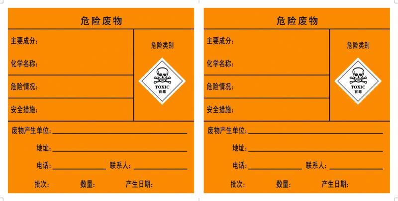 收集容器外加贴危废标签(环保局要求格式,学校统一印制。见附件2),注明废弃物主要成分(前三大主要成分。写分类,例:有机废液 甲类;无机废液 酸性;其他 高危废试剂 等)、品名(写具体废物名称)、危险情况(腐蚀性、毒性、易燃性、反应性)、安全措施(远离火种,分类收集,防止流失)、产废单位(细化到学院的具体实验室)、联系人(导师或技术人员)、产生日期(包装封好的日期)等信息,并确保容器密闭可靠,不破碎,不泄漏,对未达到要求的不予接收、处置。标签请到综合实验中心领取。